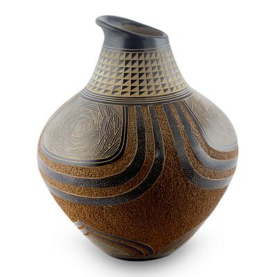 This portrait of Francisca Ramirez is superimposed on a glazed silhouette of Nicaragua. Leaning into traditional Nicaraguan ceramics, her painted image represents her environmental activism efforts, where the non-glazed portion symbolizes the government’s pressure on her community’s land.