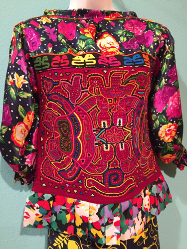 This illustration of Weni Bagama was inspired by the intricate enagua dresses worn by the Ngöbe women in western Panama. Adorned with geometric patterns radiating from the neck, enaguas are said to represent the mountains and the ripples of rivers. As Weni fights for her land and the natural flow of the river, leaves and flowers sprout as the flood has passed with the removal of the dam.