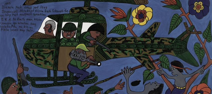 The design motif and visual style of Joe Moses’ portrait was inspired by Papua New Guinea's traditional masks and contemporary art. Almost childlike line work and bright colors depicts a warrior mask, expressing Mr. Moses fight for the rights of PNG's people.