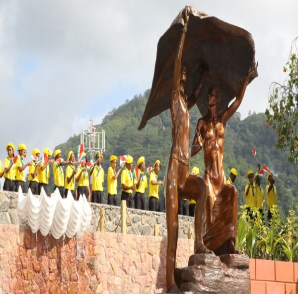 A few inspired local artists recently introduced stained glass in the Seychelles. What began as a passion project is now a burgeoning art form focused on using environmentally responsible, recycled and reused materials. Another desire of the artists is to pass on the art form to future generations ensuring an art form that is both beautiful and created responsibly. The vibrant colors of the coastlines and landscapes were the inspiration for the stained glass portrait of Sir James Mancham.