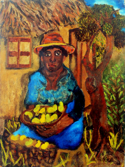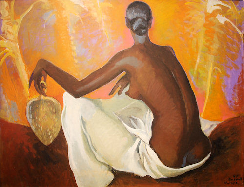 This portrait is composed of Trinidad and Tobago’s national symbols: The feathers of the Scarlet ibis and clusters of Chaconia flowers arranged in a decorative head-dress akin to those worn on Carnival. While many Caribbean nations are known for their Carnival celebrations, Trinidad and Tobago hosts the largest. The artists involved in creating these spectacles were involved choosing the national symbols for their country in the 1960s, highlighting their influence on the country’s visual culture.