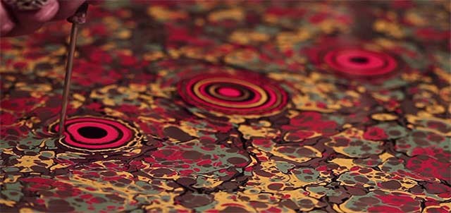 Ebru (cloud, cloudy) or Abru (water face) is the technique of paper marbling that Turks have practiced since the 16th century. Kitre (gum tragacanth) is mixed with water in a shallow container. A horsehair brush is used to add insoluble inks to the surface of the liquid. These are swirled into intricate designs and patterns. A piece of paper is placed on top of the liquid --immediately transferring the design. The dyes and inks used are often mineral based, and given the region’s bounty of these natural resources in Turkey, a broad range of colors are seen in these designs.