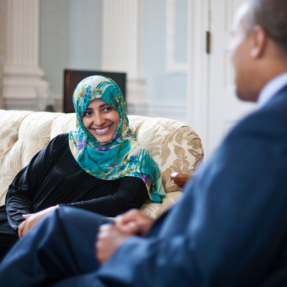 Tawakkol Karman is a Yemeni Journalist, senior member of the Al-Islah political party, and human rights activist. She leads the group “Women Journalists Without Chains” and became the face of the 2011 Yemeni uprising that is part of the Arab Spring. Yemeni’s call her the “Iron Women” and “Mother of the Revolution”. In 2011 Karman was the co-recipient of the Nobel Peace Prize becoming the first Yemeni and Arab women to receive the award.