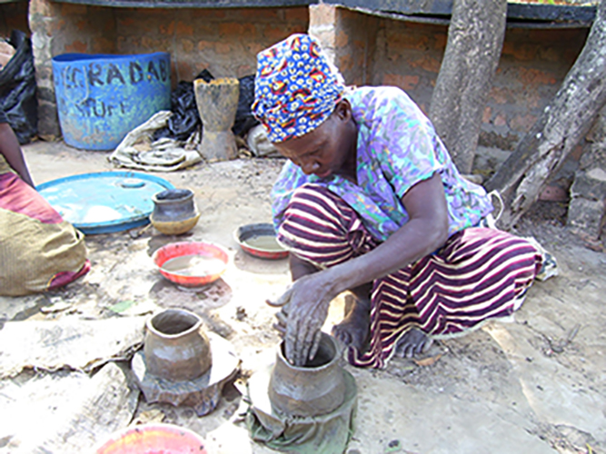 Zambian art has historically been created for functional or ceremonial purposes, using raw materials and colors that reflect the natural environment. Craftsmen in Southern Zambia are renowned for their skill in basket weaving. Thandiewe’s portrait is inspired by Tonga baskets from the region. They are made from the Ilala palm and often feature a lightning pattern.